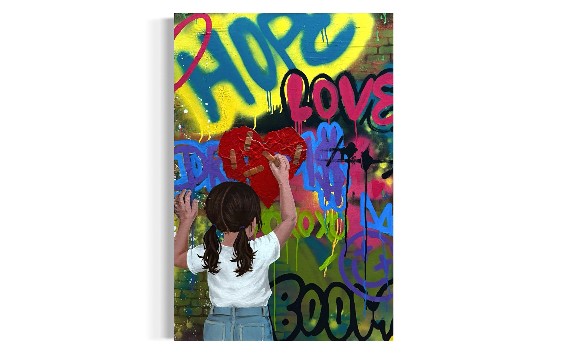 A 24 by 36 inch mixed media painting created in 2025 using spray paint, acrylics, layered paper, and real bandages.