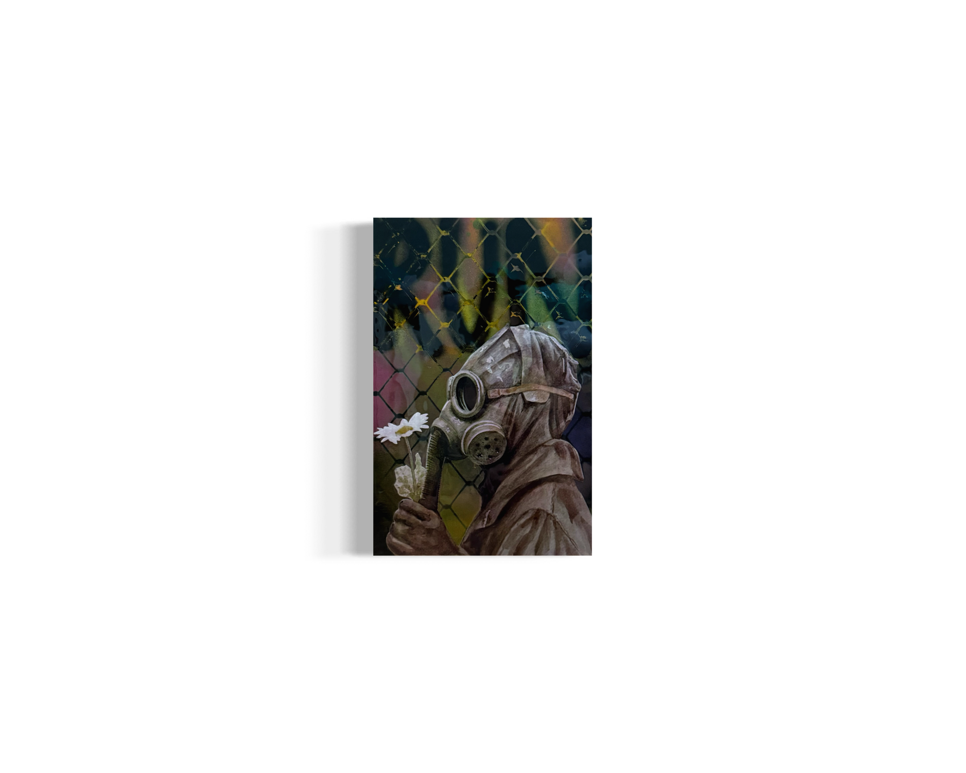 This piece combines hand-painted elements with a recurring gas mask print that the artist cuts, shapes, and integrates uniquely into each composition. While the print element appears in other works, the arrangement, painting, texture, and final assembly make this version a one-of-a-kind original.